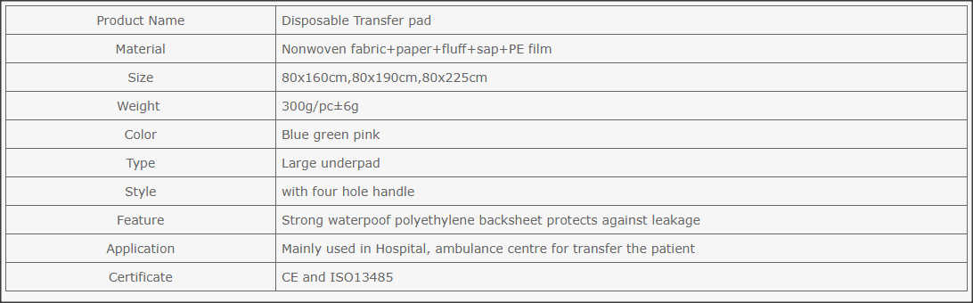 Transfer Sheet used to transfer and movement from one bed to another. This transfer sheet is very much needed in the ward, emergency department, operating theatre and etc where movement is critical for patient safety. Its made of Non Woven fabric with SAP combination for fluid absorption from patient body fluid and etc.