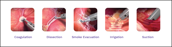 - A total rethink in the design of laparoscopic instrumentation - Superb ergonomics and performance - Instrument changes reduced during procedures - Reduces gas and smoke leakage and improves efficiency - Smoke removed at source; evacuates potentially contaminated plume through a fully closed system - Safety through improved materials and design - Better visualization of active electrode and reduction of potential collateral thermal damage - Desufflation; a much more effective method of desufflation