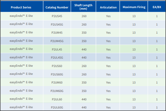 The easyEndo™ E-lite meets enhanced safety with one-touch firing mechanism. It benefits from improved maneuverability and easy access. It features a lightweight and ergonomic design for comfortable usage.